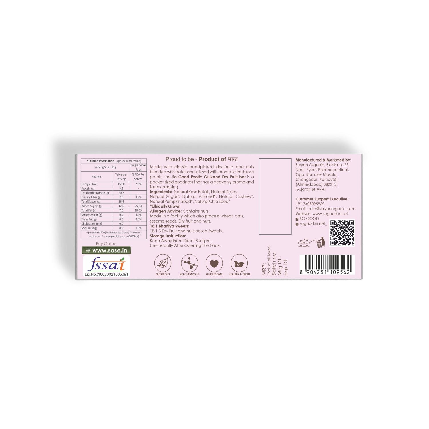 Made with classic handpicked dry fruits and nuts blended with dates and infused with aromatic fresh rose petals, the So Good Exotic Gulkand Dry Fruit Bar is a pocket sized goodness that has a heavenly aroma and tastes amazing.