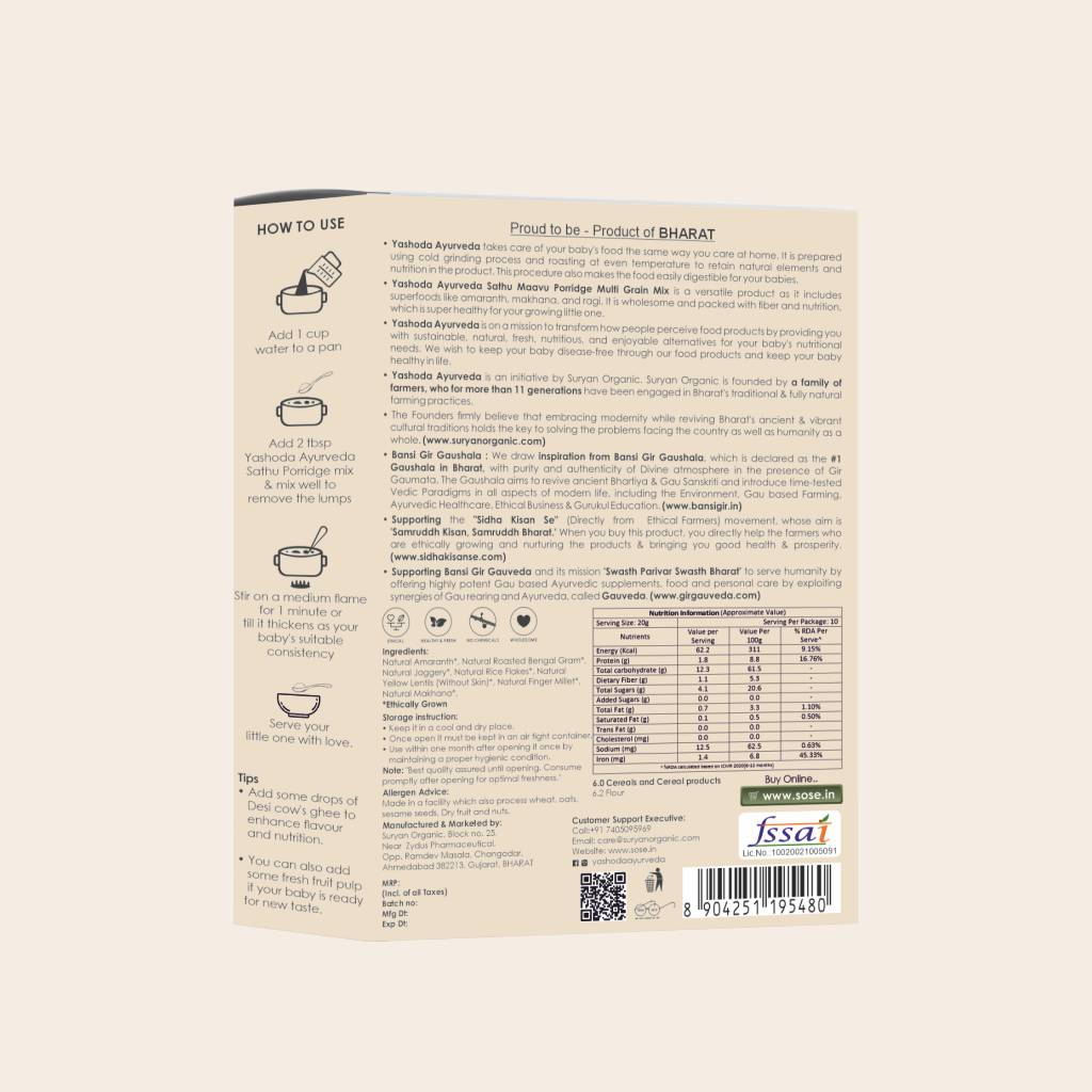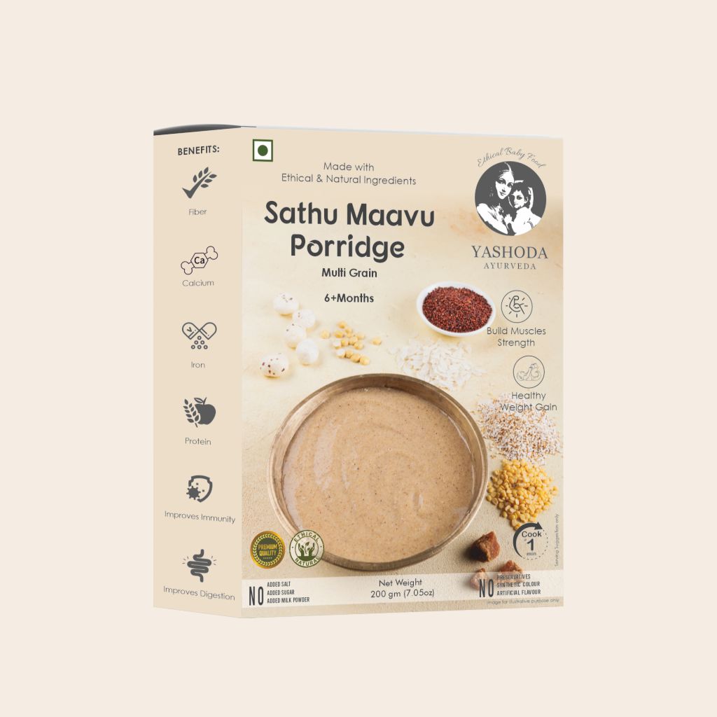 Yashoda Ayurveda Sathu Maavu Porridge exemplifies this mission and is a nutritious, traditional food designed for growing children. Crafted from a blend of roasted cereals, ancient grain millet amaranth and other natural nutrient-rich ingredients this wholesome porridge provides essential proteins, vitamins, and minerals.